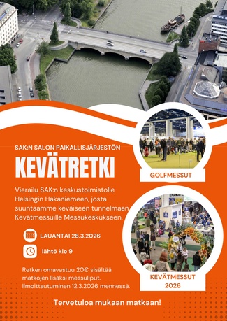 SAK:sta matka jatkuu Helsingin messukeskukseen Kevätmessuille. Messuilla ihanan, keväisen tunnelman säestämänä satoja näytteilleasettajia ja huikea valikoima tuotteita ja palveluita kotiin, mökille ja puutarhaan. Samalla lipulla pääsi myös samaan aikaan järjestetyille Golfmessuille. Omakustanteinen ruokailu messukeskuksessa, jossa monia vaihtoehtoja tarjolla. Bussi messukeskuksesta kohti Saloa lähtee klo 18.